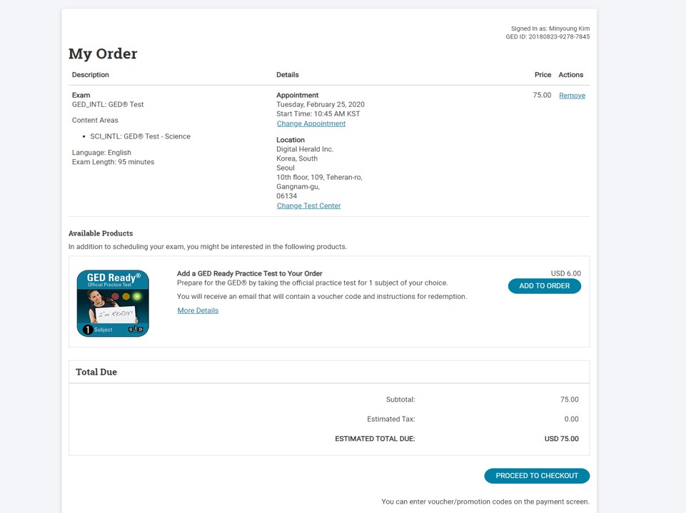 치러 145점을 넘긴 후에만 실제 GED 시험 신청이 가능하도록 정책이 변경되었습니다. 자세한 사항은 FAQ 게시판을 확인해주세요.